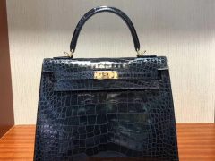 爱马仕外缝凯莉包 Hermes Kelly 25cm 7K宝石蓝 亮面鳄鱼皮 金扣