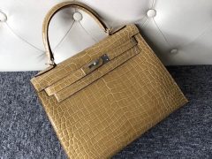 Hermes Kelly 28cm 1C Poussiere浅杏色 HCP亮面倒V 野生湾鳄