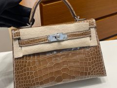 Hermes Kelly Mini Ficelle Shiny Alligator Crocodile Silver Hardware