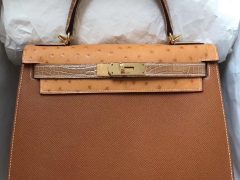 Hermes Kelly 28cm Epsom金棕色/鸵鸟金棕色/亮面鳄鱼杏色 金扣