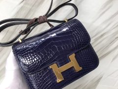 Hermès Constance 19cm M3墨水蓝 Blue Encre 亮面方块 美洲鳄
